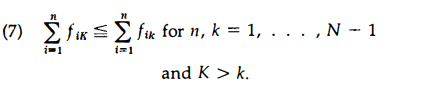 Two properties of matrix F are central to the argument that follows. The first is that a rise in the price ratio w1/w2 increases the probability of higher-numbered states (higher a2/a1) conditional on each and every initi al value of a2/a1. Specifically, if fik are the coeffi­cients following the increase in the relative price of variable factor 1, we have