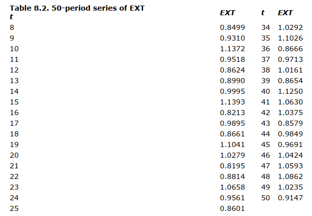 Industry and market simplifications. To study the impact of selected internal firm parameters on the model, we have simplified the industry by treating only the two-firm case. There are two firms in the industry, competing in the same market. There are no product differences between the two firms. In addition, we consider only one set of market parameters and a market in which the exogenous factor contributing to total demand ( EXT ) is subject only to modest random fluctuations around the mean. Values used for the market parameters and initial conditions are shown in Table 8. 1. EXT was normally distributed with a mean 1.0 and a standard deviation 0.1. Values of EXT were serially independent and are listed in Table 8.2.