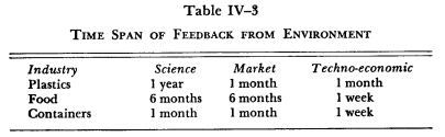 The final factor in which we were interested is the required degree of differentiation in time orientation. Our findings in the plastics industry indicated that this would be related directly to the time span of feedback in the different parts of each environment. The data collected on this point clearly suggest that the required differentiation in time orientation was highest in the plastics industry, followed by foods and containers (Table IV-3). The time span of feedback in the container environment was fairly similar in all parts, ranging between just one month and one week. In con-trast, the time span of feedback in plastics ranged from one year for the scientific sector to one month for the techno-economic. Managers in the different units in a container organization, then, would all tend to be oriented toward the same short time horizons, as compared to the quite different time outlooks described in Chapter II for plastics managers. Again the food industry seemed to fall between the other two, with the required differentiation in time orientation less than in plastics but greater than in containers.